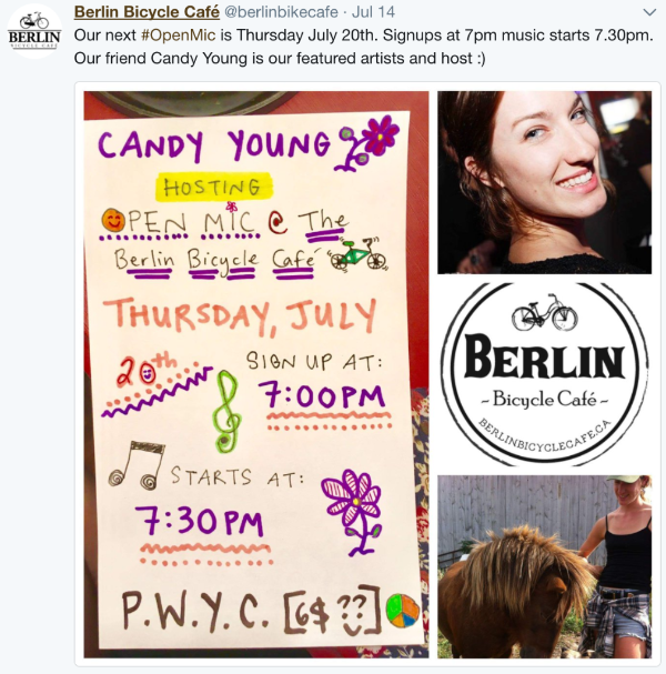 The Berlin Bicycle Cafe's next open mic night is Thursday, July 20. Signups at 7pm, music starts 7.30pm. Your MC for the night is Candy Young.