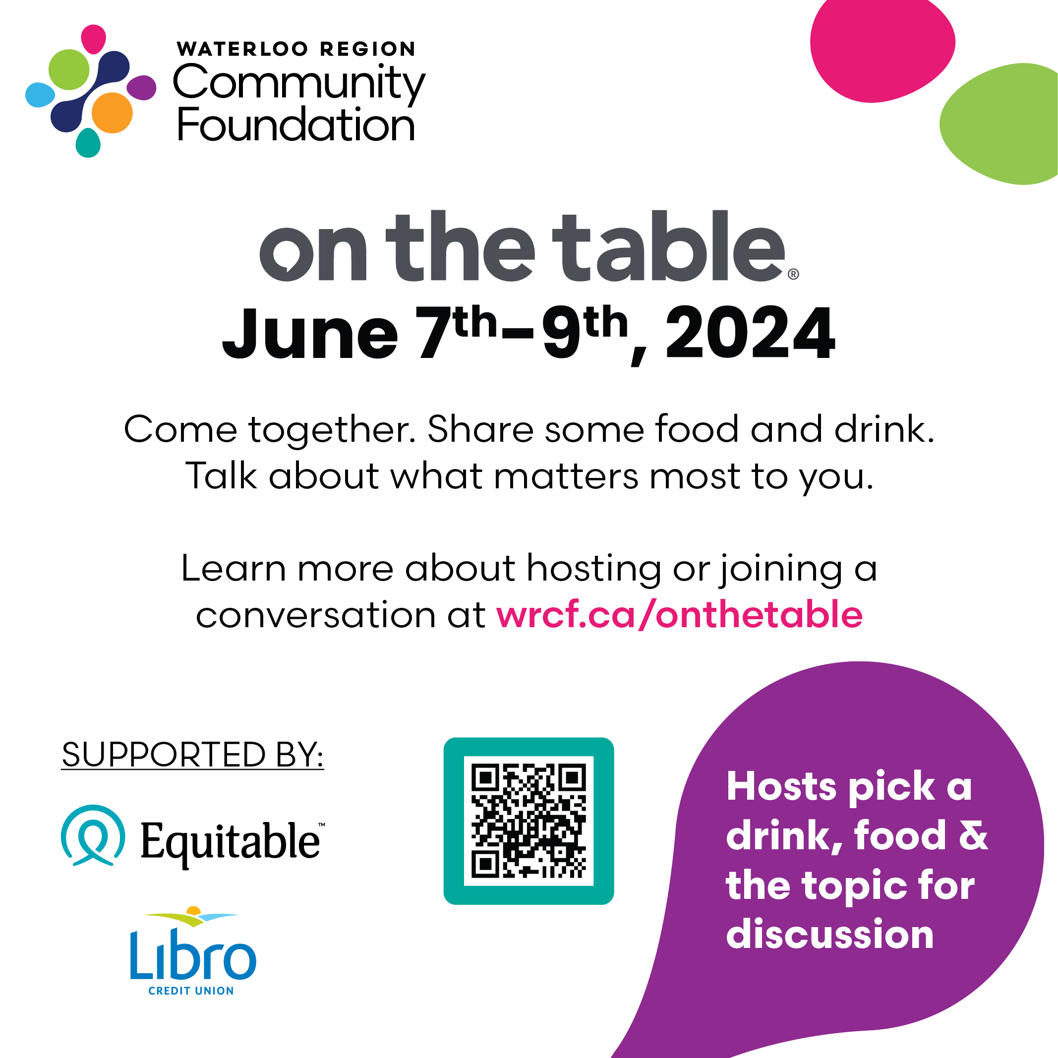 On the Table is an event organized by Waterloo Region Community Foundation to encourage community connection. Bring together your friends, colleagues, neighbours, and people in the community over some food to talk about what matters most to you. Learn more and get involved at wrcf.ca/onthetable.