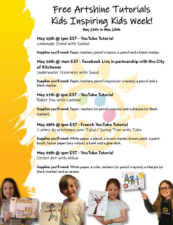 This week is Artshine's “Kids Inspiring Kids” week. It's five days of kids teaching kids art. All the things you need are listed here - just subscribe to their YouTube channel and set a reminder!
