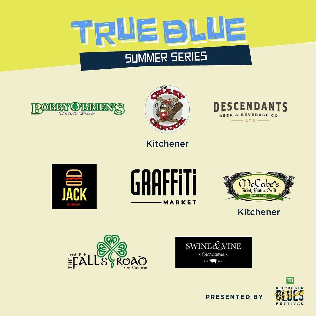 The Kitchener Blues Festival True Blue Summer Series takes over Bobby O'Briens, Swine & Vine, Descendants Beer & Beverage, Jack Burger, McCabes Kitchener, The Crazy Canuck, and the Falls Road Irish Pub with live blues this weekend. It's highly recommended to call in to the venues to make reservations.