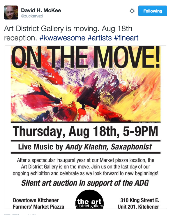 I recently wrote about the Art District Gallery's search for a new space on Communitech News. They're howing a moving reception this Thursday, August 18 at the Kitchener Market.