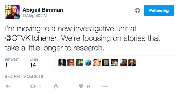 CTV Kitchener is launching a new investigative unit with Abigail Bimman. The best news is local news - looking forward to seeing what they dig in to. Also, trying to find a way to work "maleficence" into this.