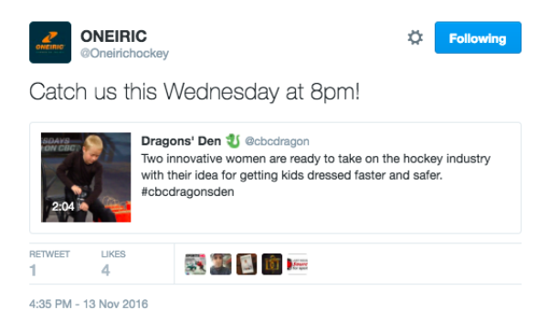 Local hockey wear startup Oneiric is on Dragon's Den this Wednesday, November 16 at 8pm!
