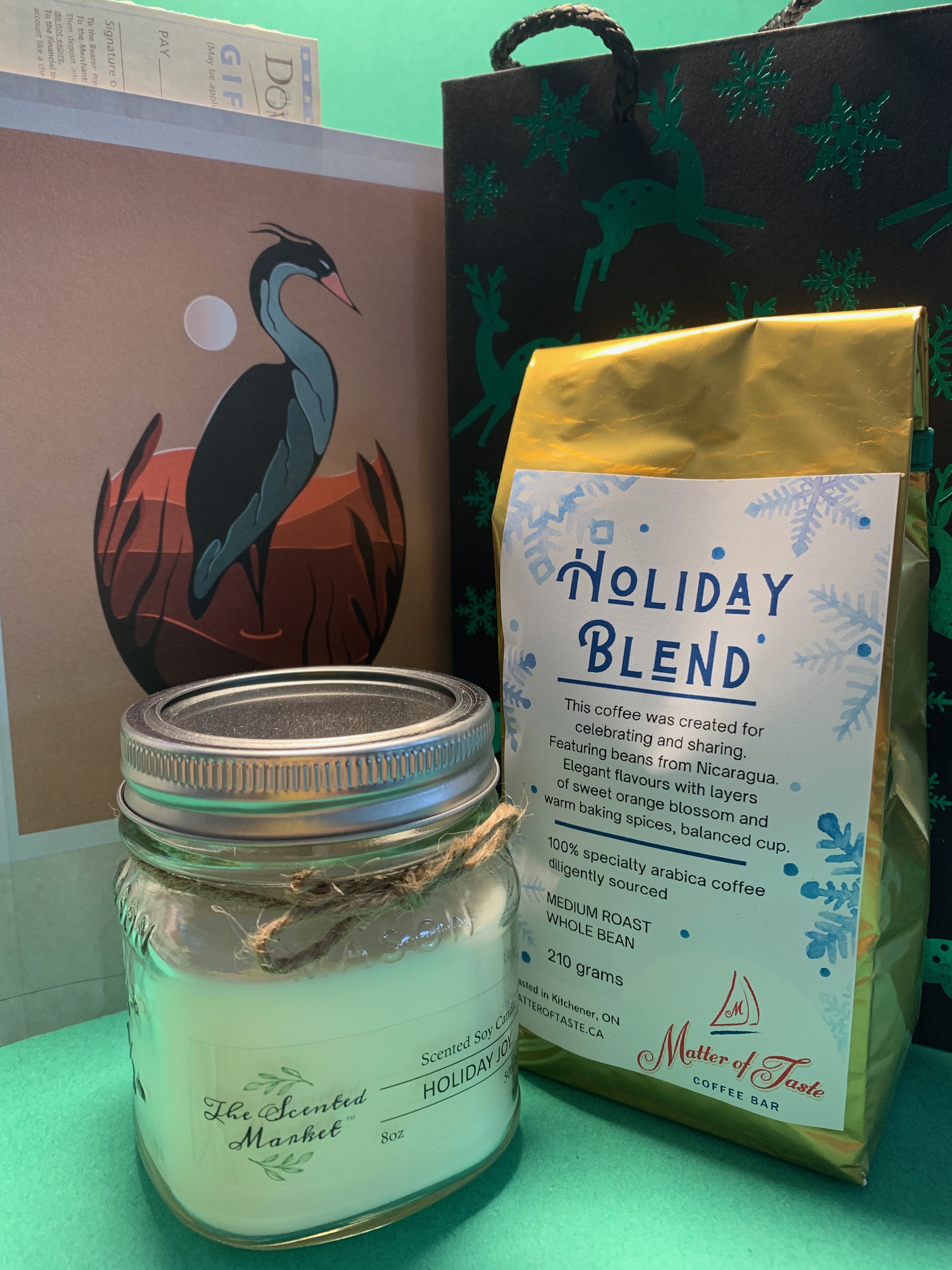 We ran our first giveaway on Instagram this week. If you don’t follow us on Instagram, that’s cool – everyone who subscribes to the newsletter was automatically entered. It was a giveaway where you didn’t have to do anything (except find a copy of “The Night Before” with Seth Rogen for an extra bonus entry, which unfortunately no did). ANYWAYS, the winner is Kaitlin Kok! Congratulations on winning this gift back with a candle from The Scented Market, a bag of holiday blend coffee beans from Matter of Taste, a copy of the Downtown Kitchener Art Walk Guide, and $10 Downtown and $10 Uptown Dollars to spend at a local business.
