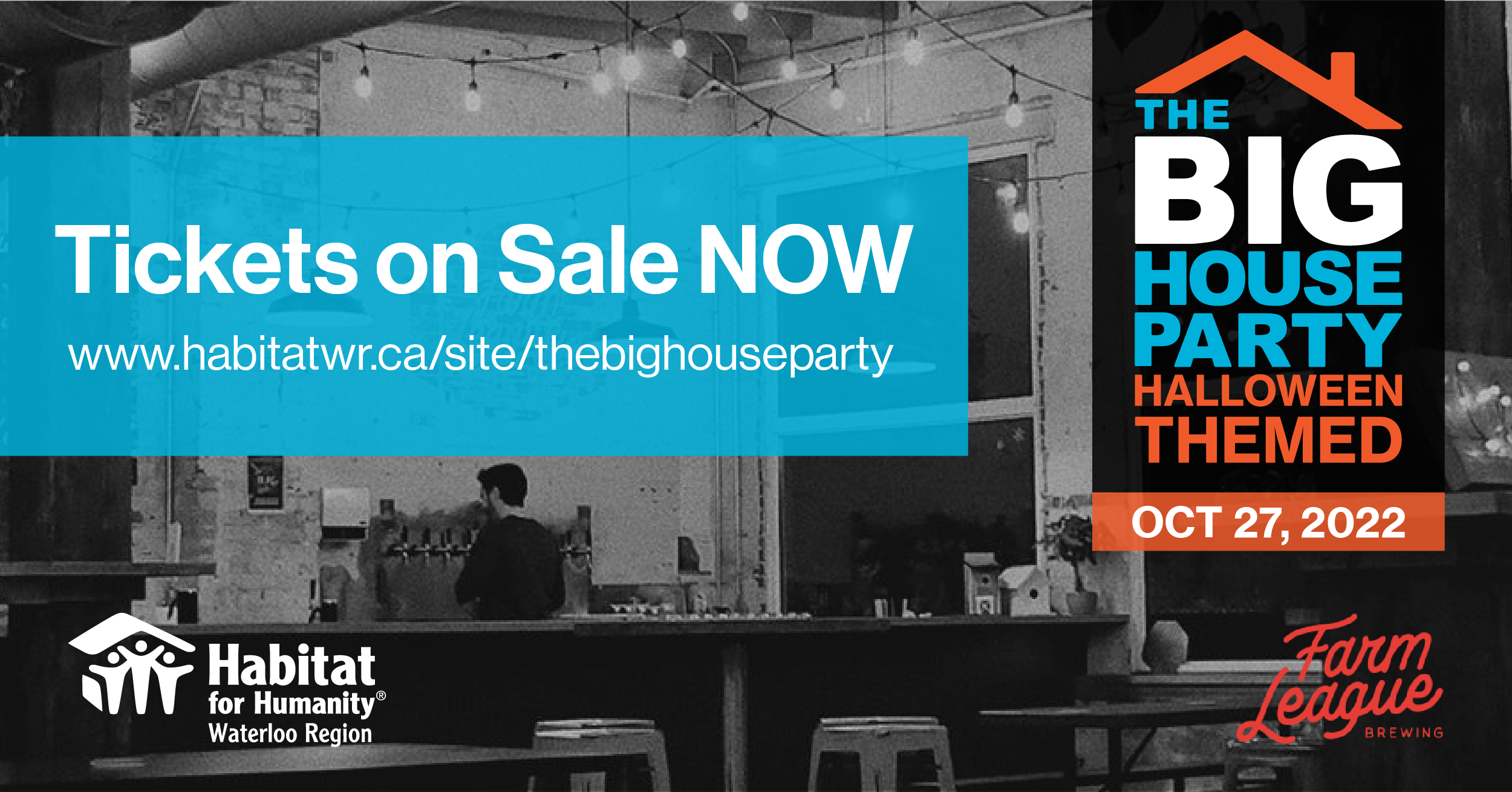 Habitat for Humanity Waterloo Region’s Big House Party is back in person this year! Join them on Oct. 27 from 6:00 - 9:00 p.m. at Farm League Brewing for a fun night of drinks, activities, live music by FireTrain and delicious food provided by Schmuck Truck and The Funnelcloud. This fundraising event directly supports Habitat for Humanity Waterloo Region’s mission to build safe and affordable homes for families in our community, such as the homes they are building in Cambridge in 2023.
