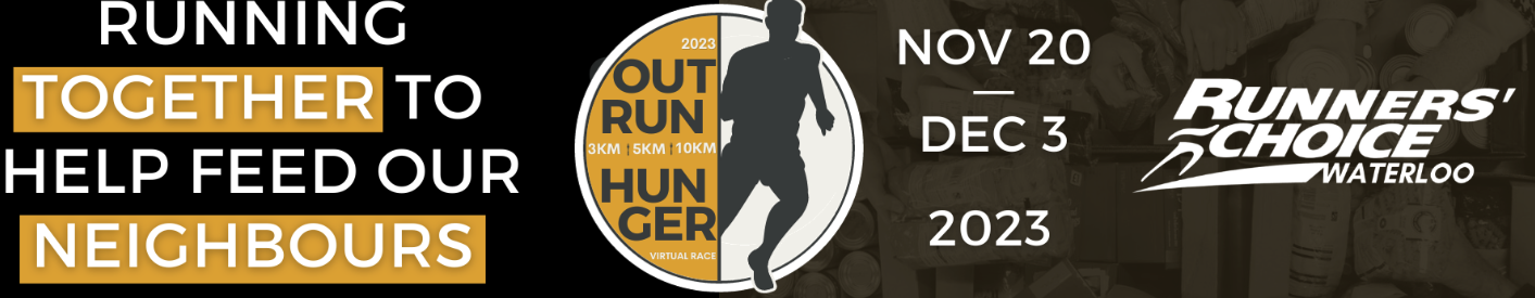 Outrun Hunger is an annual two week-long 3km, 5km or 10km virtual run/walk in support of The Food Bank of Waterloo Region. Registration fee is $10.00. All registration fees will be donated directly to The Food Bank of Waterloo Region. Any donations made in addition to the registration fee will be eligible for a tax receipt – every $1 you share will provide 2 meals. All registrants will be eligible to win prizes courtesy of your favourite local run shop, Runners' Choice Waterloo!