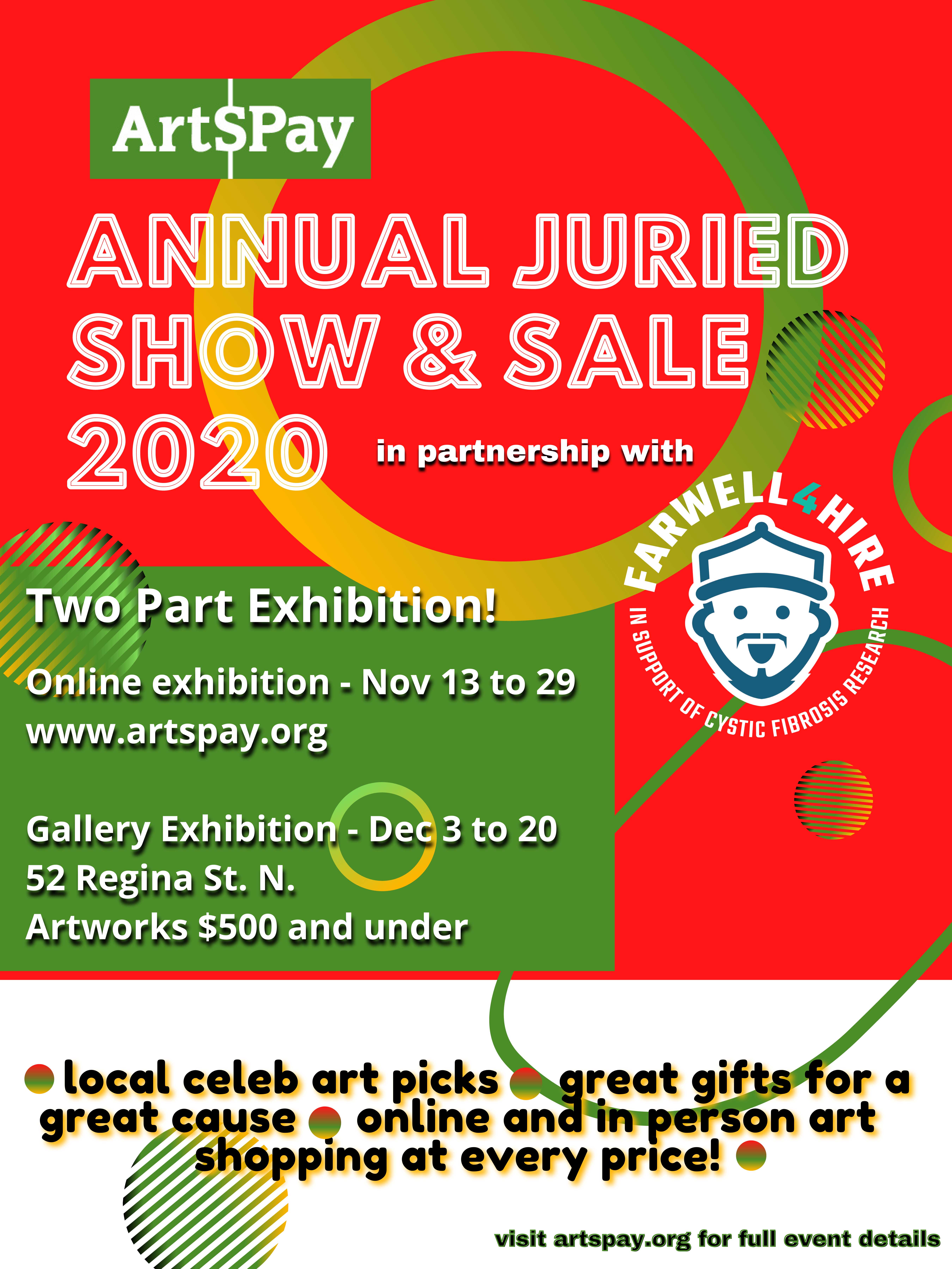 Art$Pay is taking theirAnnual Show in a new two part direction! There will be a little something for everyone. Part 1 will be totally virtual so you can see the art from the comfort of your home. Part 2 will take place at Art Incubate and feature a selection of works under $500-perfect for finding great gifts! Art$Pay is also teaming up with Farwell4Hire to raise money to Cystic Fibrosis Canada. More info at artspay.org and https://www.kwcf.ca/farwell4hire
