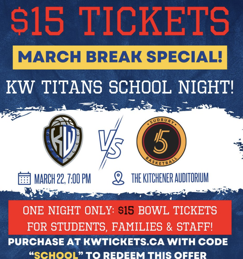 The KW Titans take on the Sudbury Five on Wednesday Mar. 22 at 7:00 p.m. Use the code "SCHOOL" and come out to the Aud for some amazing professional basketball!
