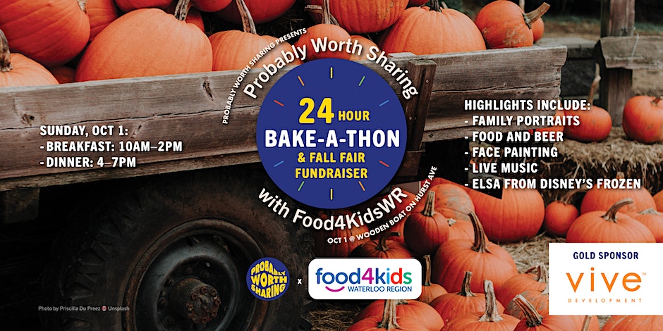 Our friend Marko at Probably Worth Sharing is throwing an awesome fundraiser for Food4Kids Waterloo Region on Sunday, Oct. 1. Probably Worth Sharing and several local small-business sponsors are hosting a 24-hour Bake-A-Thon and fundraising event, where Waterloo Region residents are invited to come together as a community, play games, enjoy food, and donate (money or non-perishables) to end chronic hunger.
