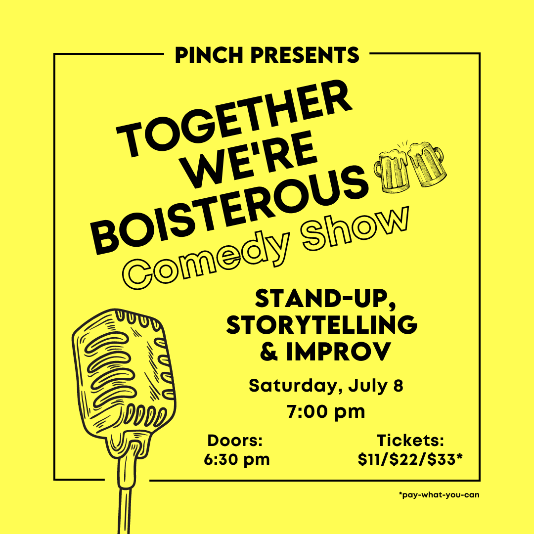 The Pinch Cabaret monthly TOGETHER WE'RE BOISTEROUS comedy show takes over TWB Brewing Co-Op featuring stand up, improv, storytelling & hip-hop beats from Manoela Oliveira, Jimmy England, Renee Groux, Bill Tregunna, Jay Reid, Edan it again, and Ben Gorodetsky.