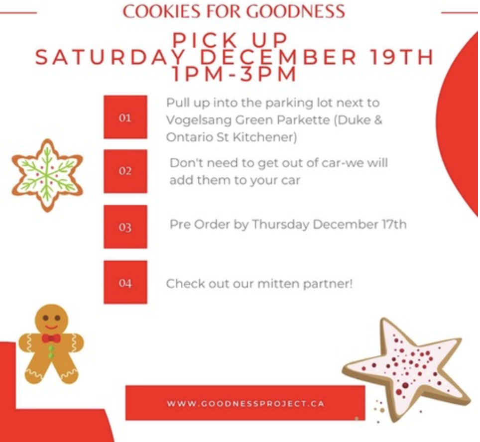 The Goodness Project is sprinkling goodness across our community. From the folks who bring you Summer Lights Festival, the Goodness Project is selling DIY cookie decorating kits to raise money for over 30 organizations/initiatives that help our neighbours. Learn more at The Goodness Project. You can also pick up your kits this Saturday at Vogelsang Green in DTK. They’ll be accepting mitten donations for the Winter Warmers project too.