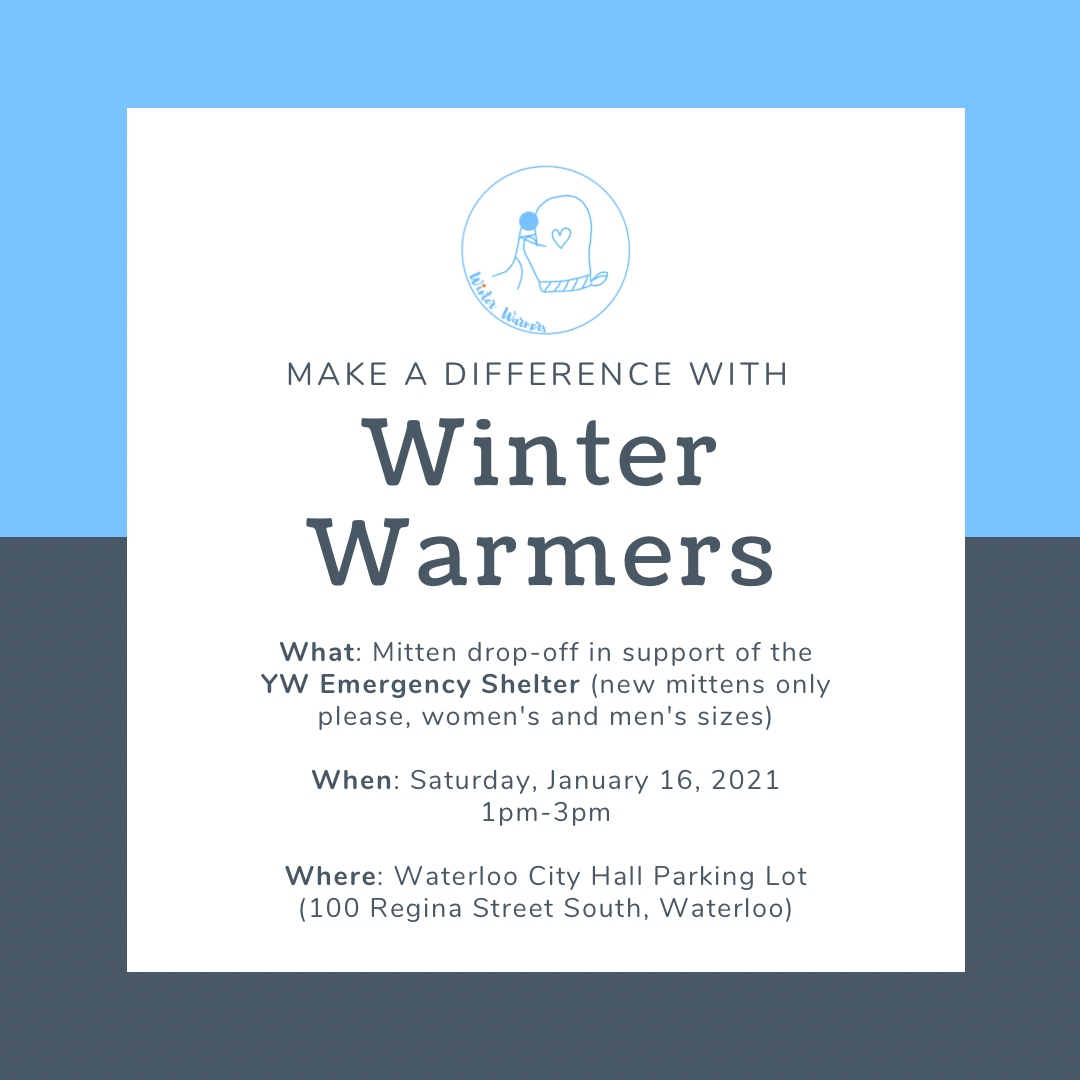 Rebecca Wagner is running a Winter Warmers Mitten Drive this Saturday, January 16 from 1 to 3pm in the Waterloo City Hall Parking lot. The drive is in support of the YW Emergency Shelter.