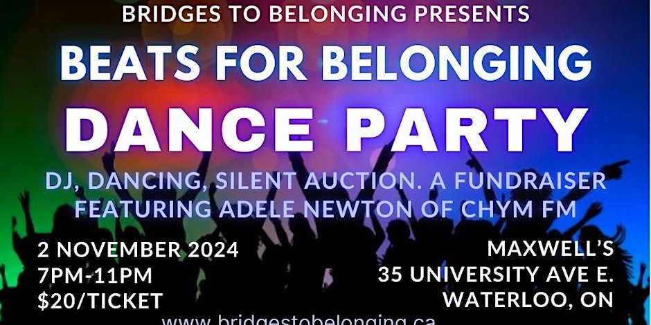 Join Bridges to Belonging, a live DJ, and Adele Newton from CHYM to support people with disabilities to belong in Waterloo Region. It’s a fun night of music, dancing, and a silent auction all to raise money so that people with disabilities and their families can have a facilitator walk alongside them as they explore what belonging could look like for them
