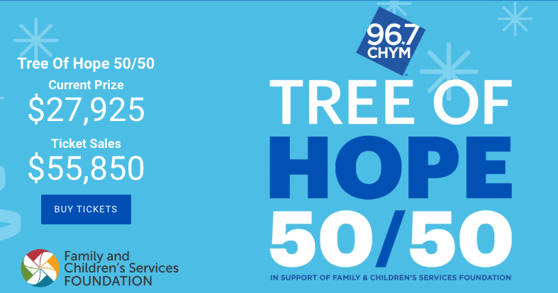 Get Your Tickets for the CHYM Presents Tree of Hope 50/50 raffle! Half of the proceeds support the Family & Children’s Services (FACS) Foundation, creating brighter futures for youth, children, and families in Waterloo Region. Buy your tickets at www.facs5050.com until December 19th at 8:45 a.m. Tune in to CHYM 96.7 between 8:45-9 a.m. on December 19th to hear the winner announced live!