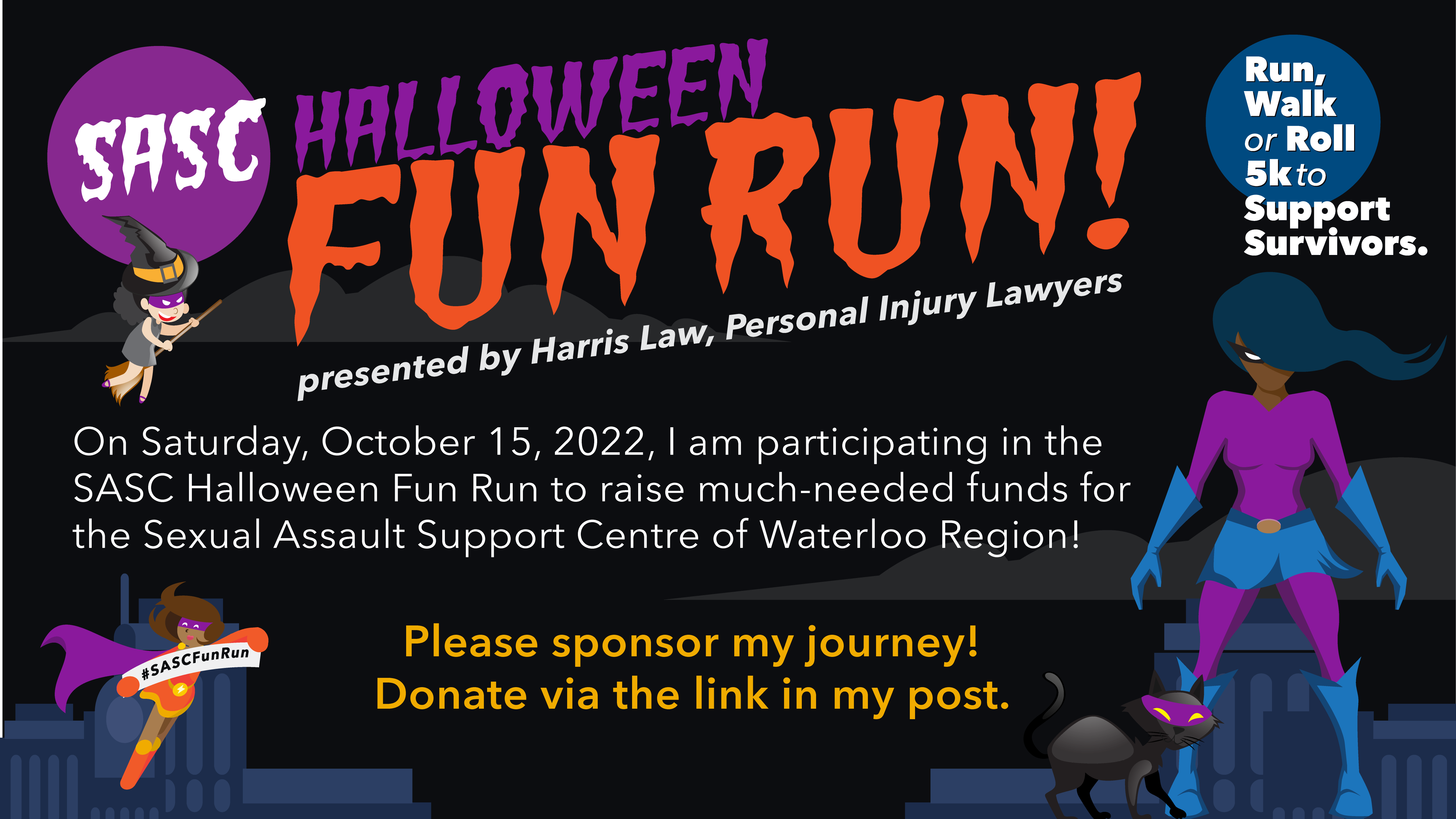 My kid and I are running in the #SASCFunRun to fundraise for the Sexual Assault Support Centre Waterloo Region. They’ve faced a big increase in demand for their services and there’s currently a waitlist of over 200 people. Let's help grow support for local survivors of sexual violence. Donate Here