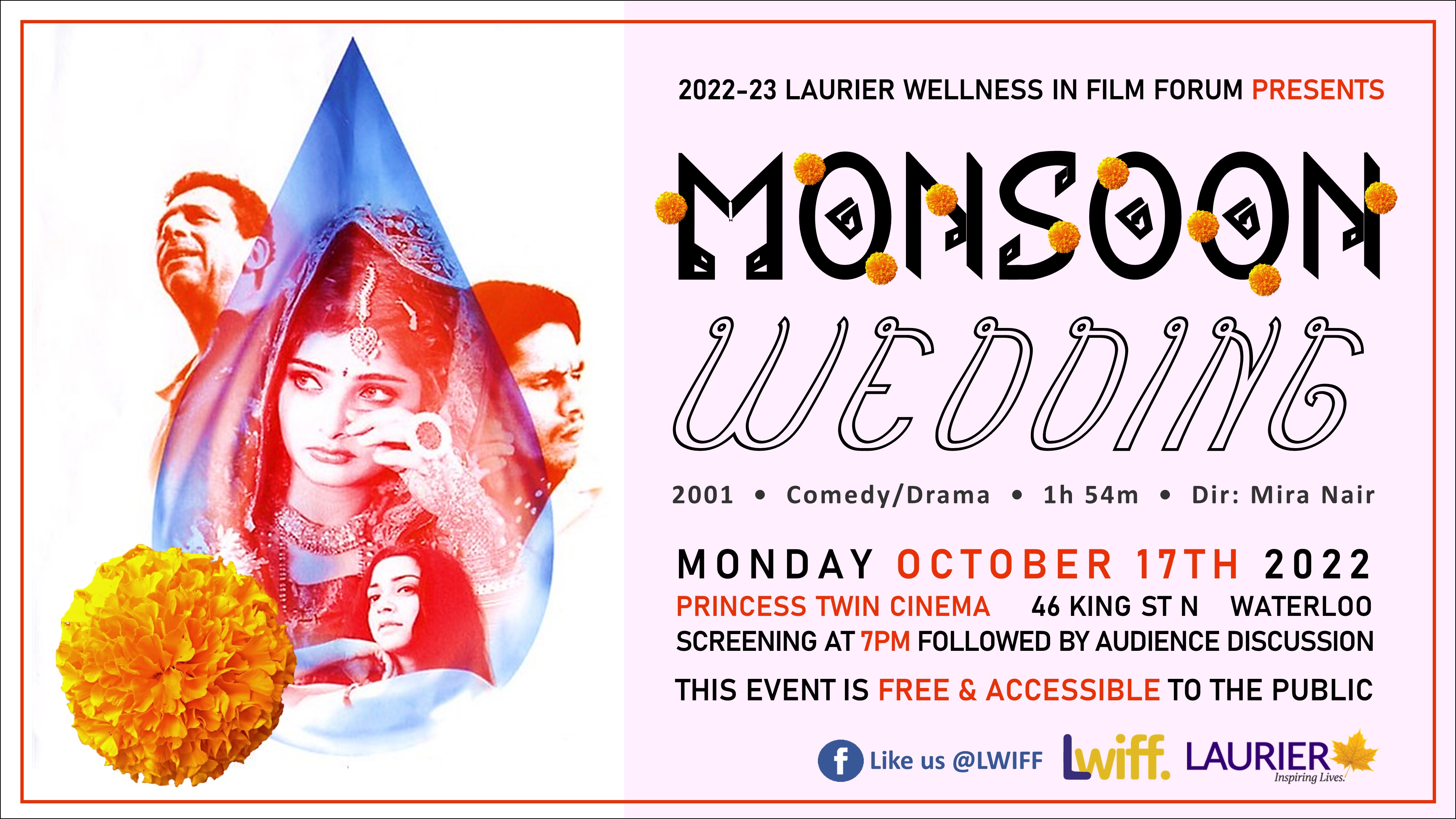 The Laurier Wellness in Film Forum is back at the Princess Twin Cinema in Uptown Waterloo. Join them on Monday, Oct. 17 for a screening and discussion of Mira Nair's colouful and emotional wedding flick, MONSOON WEDDING (2001). Showtime is 7 p.m. and this event is free and open to the public.