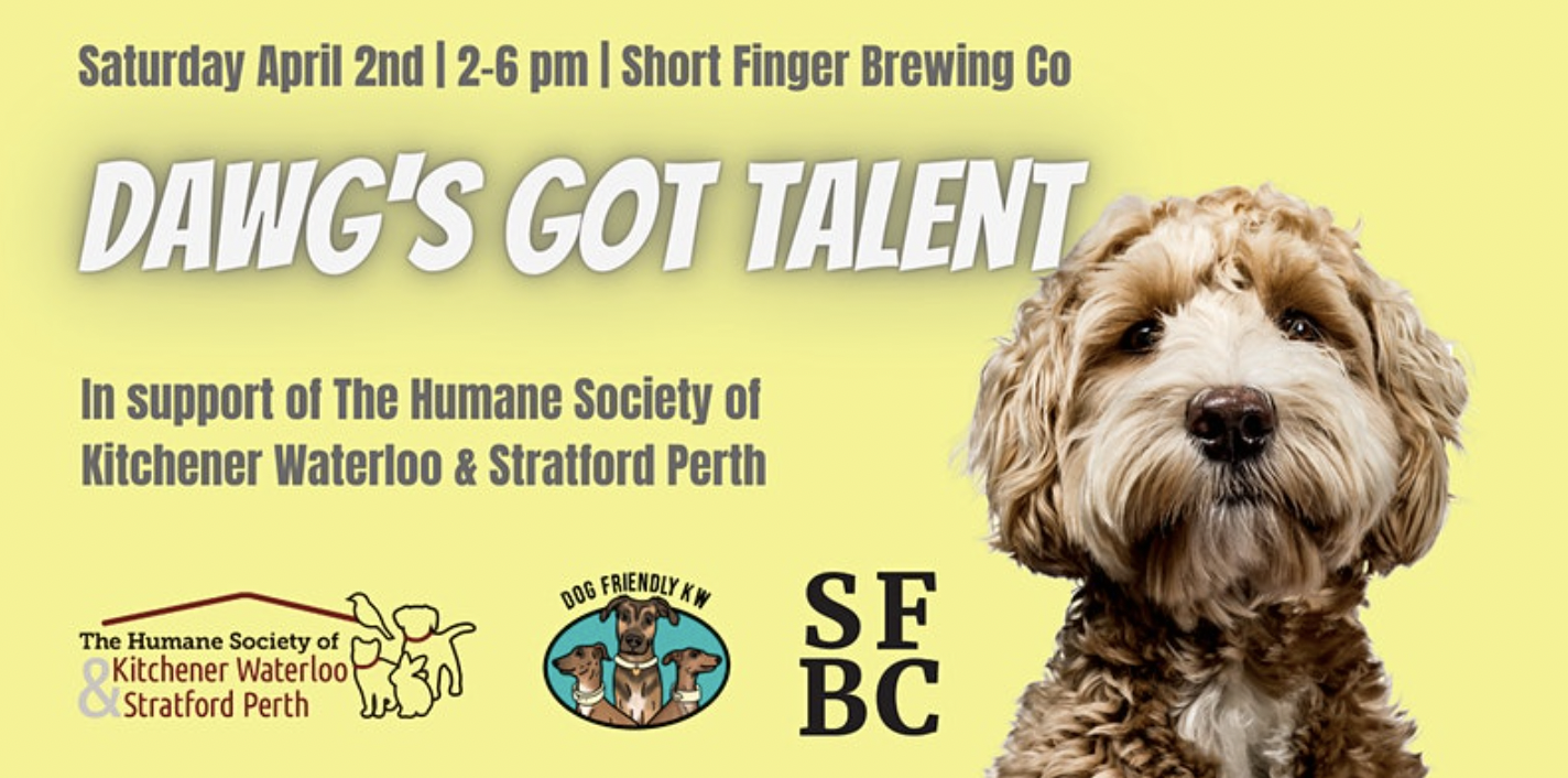 Dog Friendly KW, Short Finger Brewing Co, and The Humane Society of Kitchener Waterloo & Stratford Perth have partnered to bring you KW's first ever DOG talent show! Enjoy some of KW's best beer and watch dog's show off their best talents ($10 per person). Limited seats available.